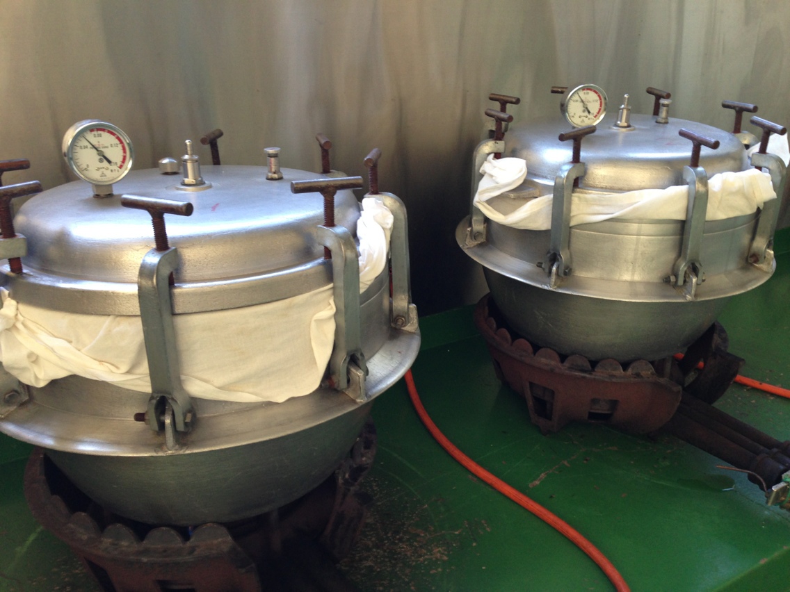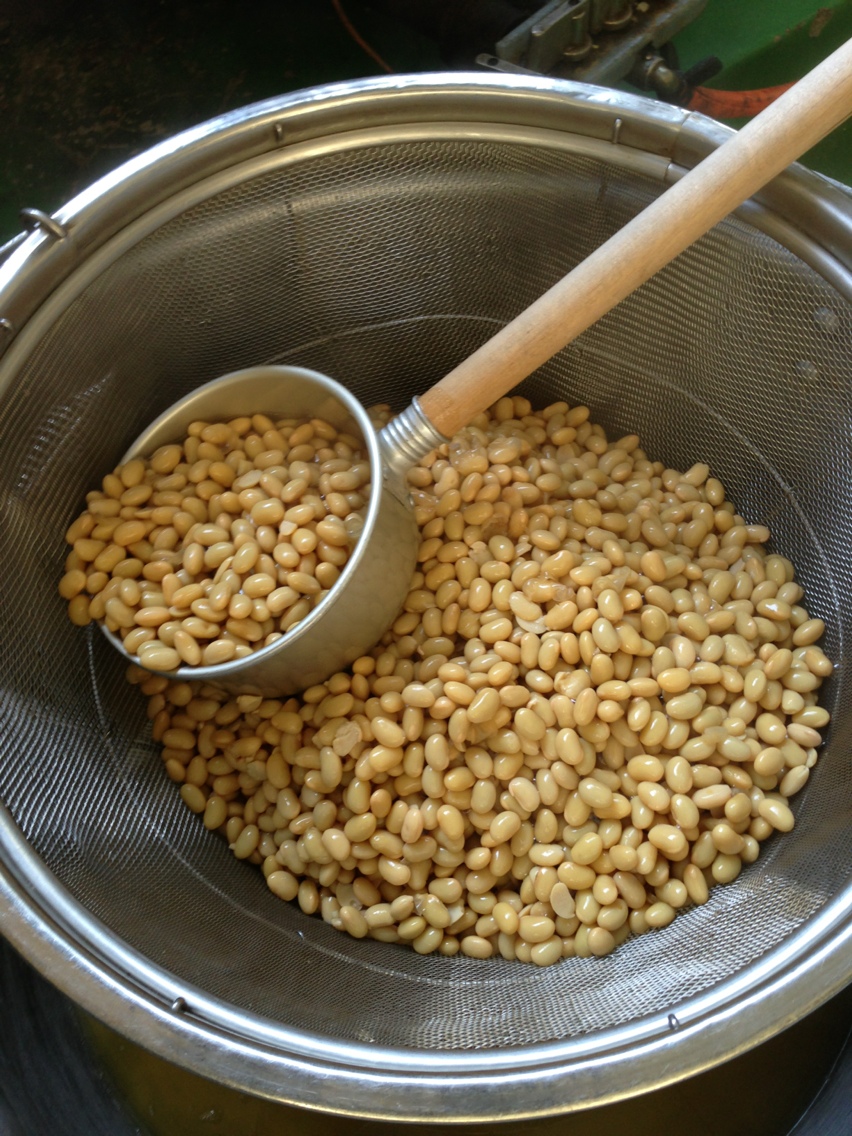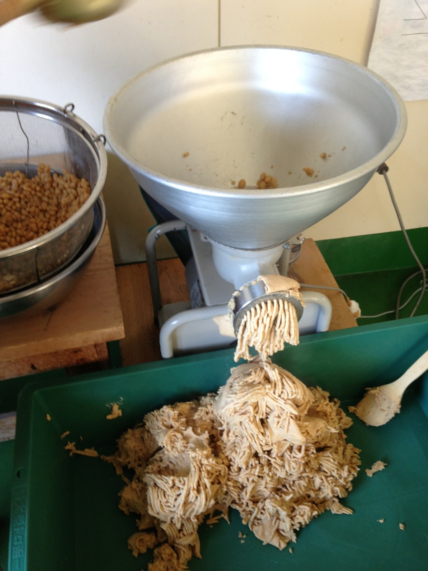 有機大豆を圧力釜で煮て、すり潰し機でミンチにして〜