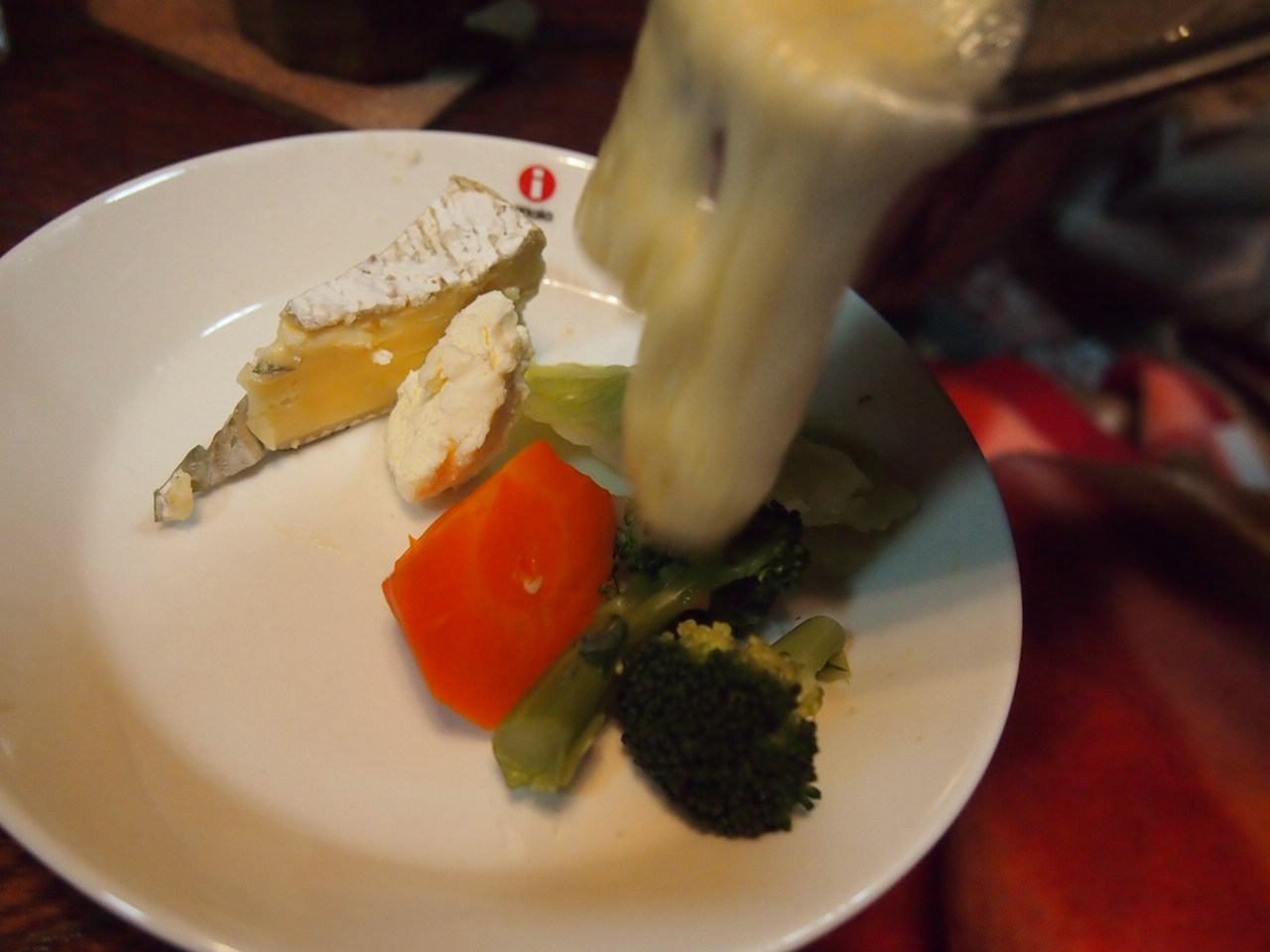 茹でたジャガイモ、タマネギ、ニンジン、ブロッコリー、そして地元パン屋さんのライ麦パンにトロトロアツアツのチーズをかけていただきました。