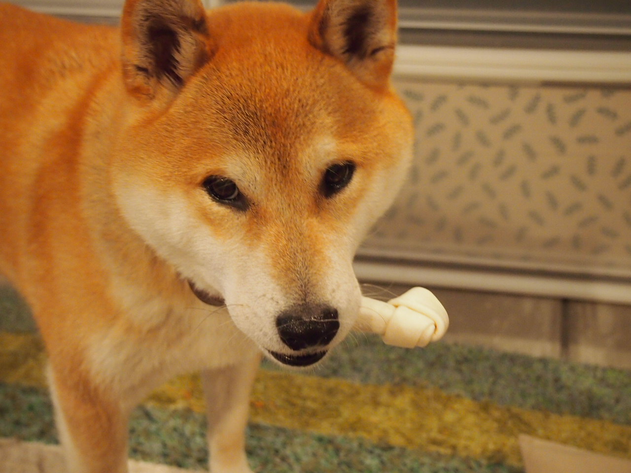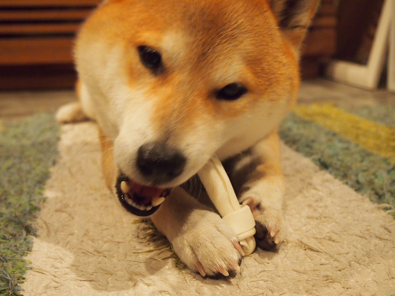 そんなポチ、最近は牛皮でできた骨型のオヤツがお気に入りです。