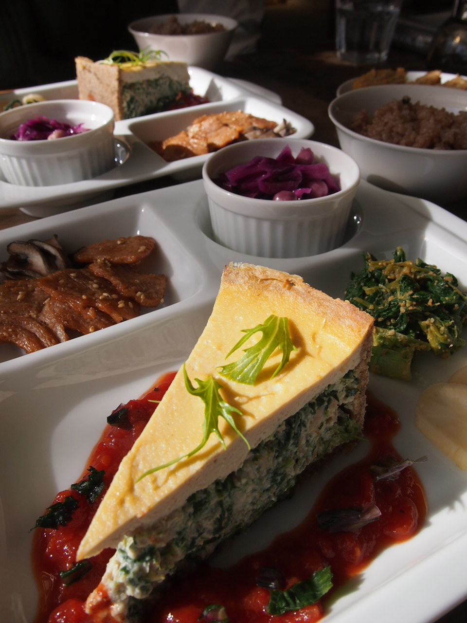 週替わりヘルシープレートは、にんじんドレッシングのサラダに始まり、ボリューム満点のキッシュなどの総菜プレート、酵素玄米ご飯、お味噌汁など、盛り沢山です。