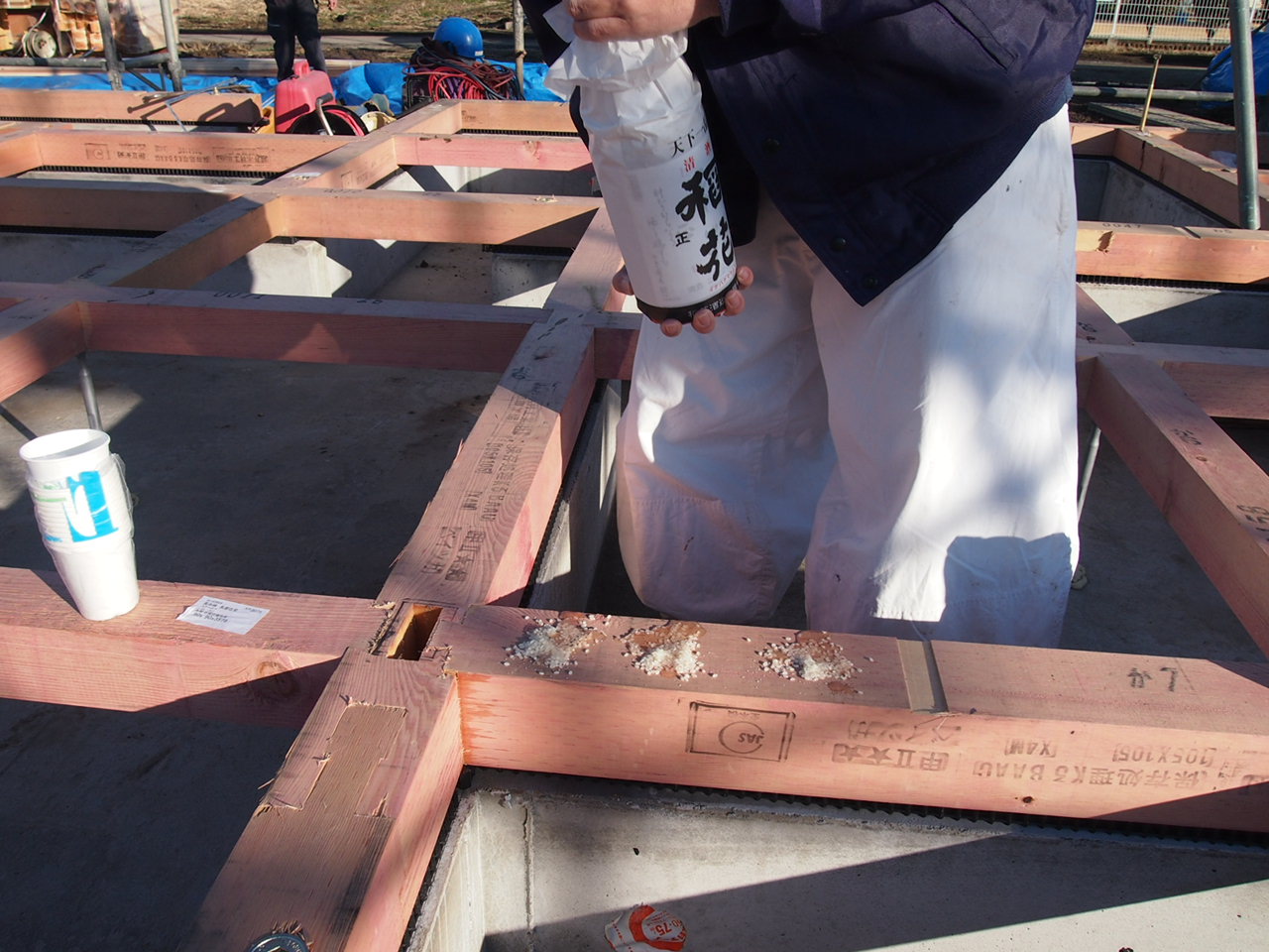 大工さん達は少しだけ口をつけたら、土台や敷地にピシャッとお神酒を振り掛けて工事の無事を祈願していました。