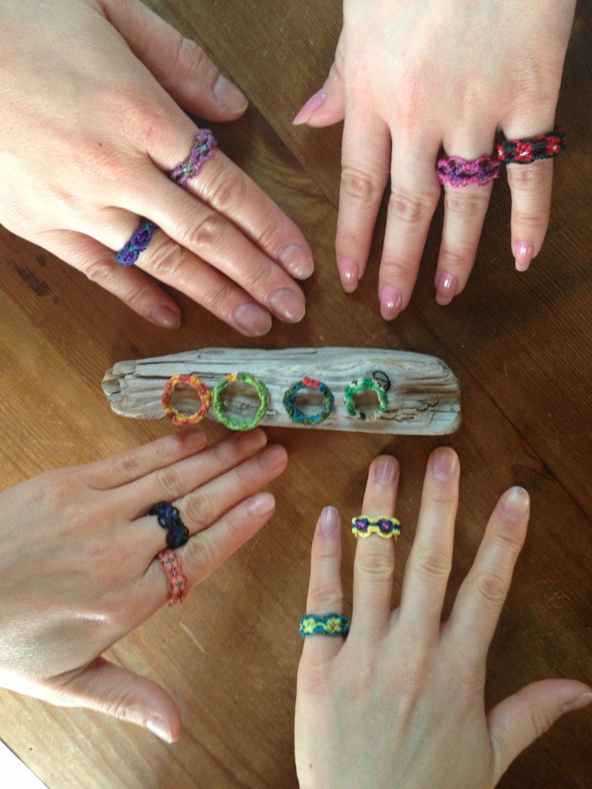 みんなで楽しく、蝋引きの糸を編んで指輪を作りました♪