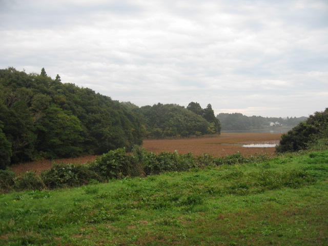「湖畔荘」で朝食をとった後、歩いて10分ほどの海岸まで同室女性たちと散歩に行きました。「湖畔荘」の名の通り、すぐ近くに大きな堰(ぜき・農業用ため池)があります。