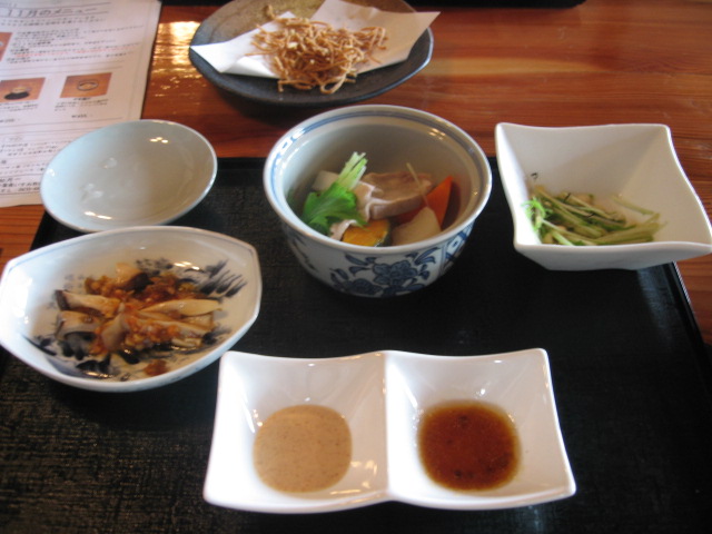 蕎麦ランチセットは月替わり。水菜のおろしドレッシング、エリンギのソテー辛味ソース、11月の温野菜、お蕎麦、きび団子、サービスで地元牛乳を使った濃厚寒天やハーブティーなどもいただきました♪
