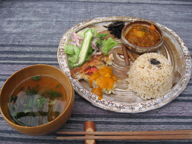 お豆富とキノコのキッシュ、グリーングリーンサラダwith大豆ホットドレッシング、秋野菜の重ね煮、ひじき蓮根、玄米ごはん、モロヘイヤと雑穀のスープ、ごぼうのにんにく醤油漬。どれもお味はしっかりしているのに、ヘルシーでカラダに優しい。デトックス効果も期待できますね♪