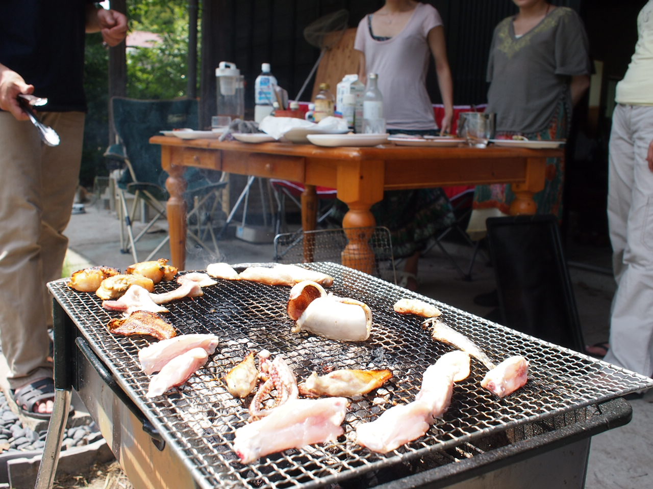 お肉の他、房総産のハマグリ、イカ、イワシ、特製サラダなどもいただきました♪ 今日は日射しが強かったので、軒下の日陰で。