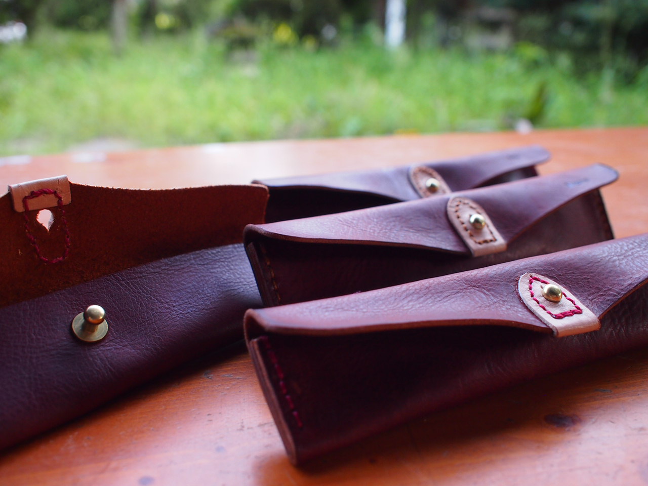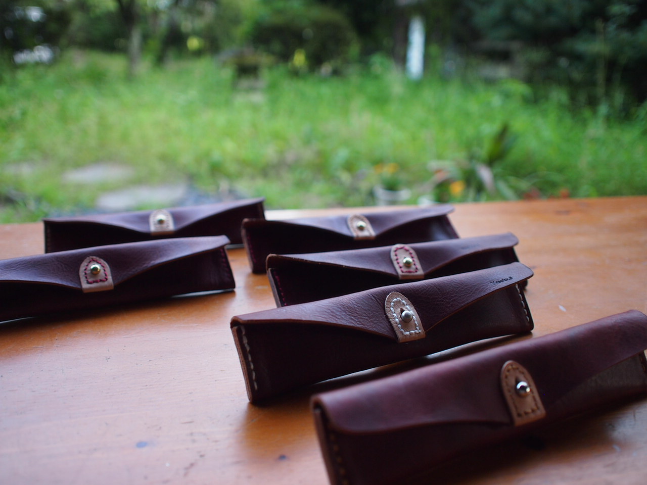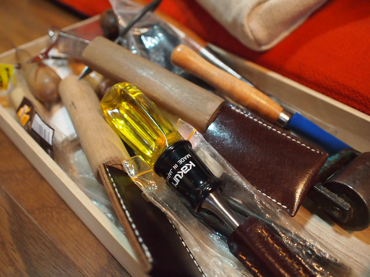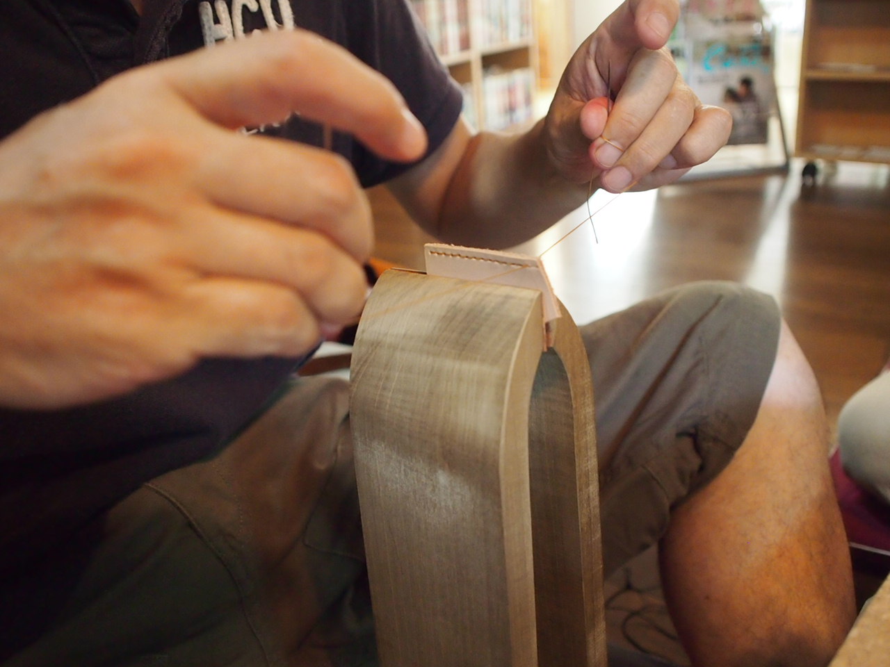 それぞれ好みの革を選んで(全て同じ革なのですが、少しずつ模様や色味が違うのです)、色々な道具を使いながら縫いあげていきます。