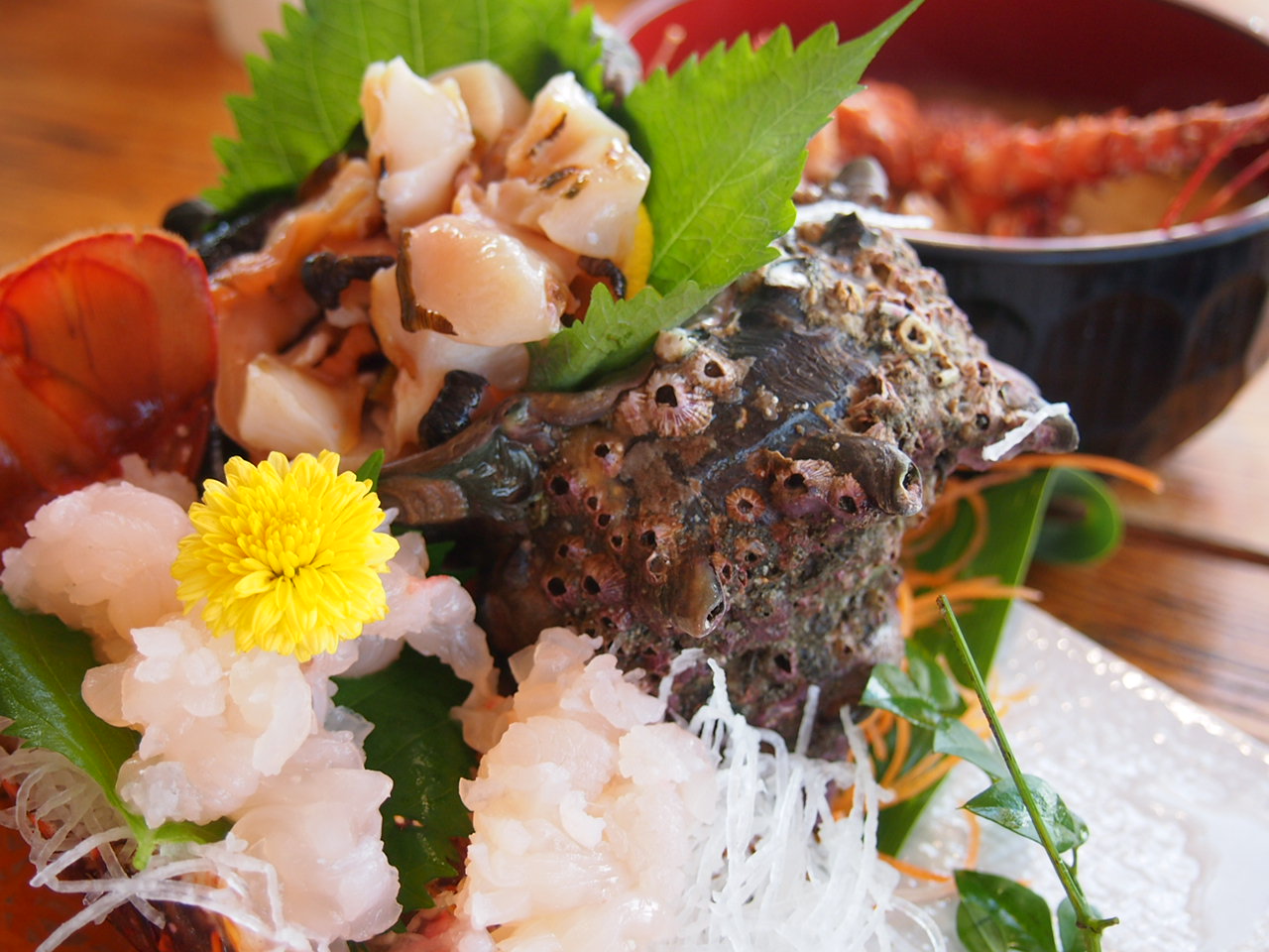 今日は刺身定食と、サザエ & 伊勢エビのお造りもいただきました!