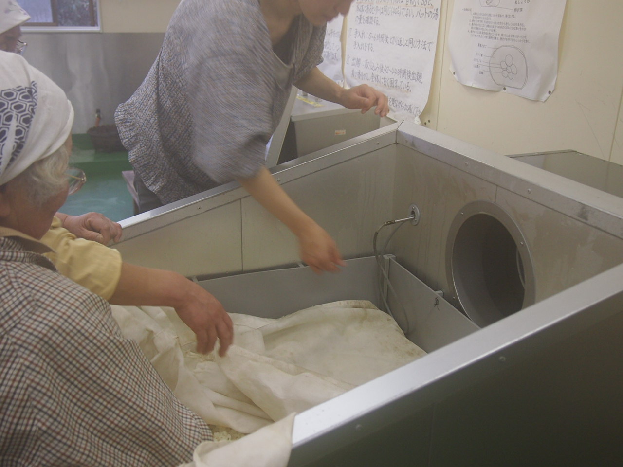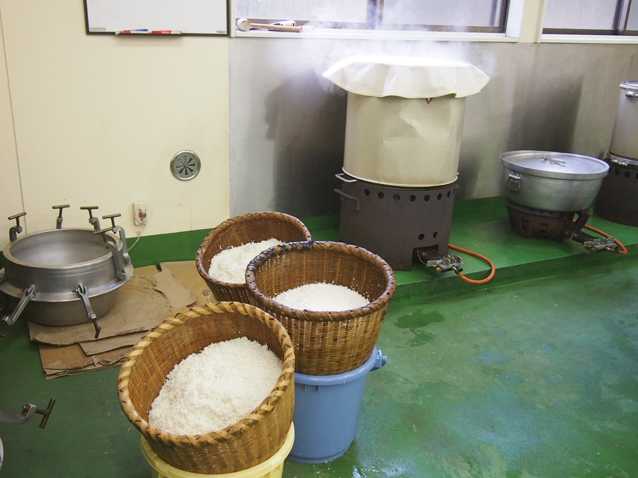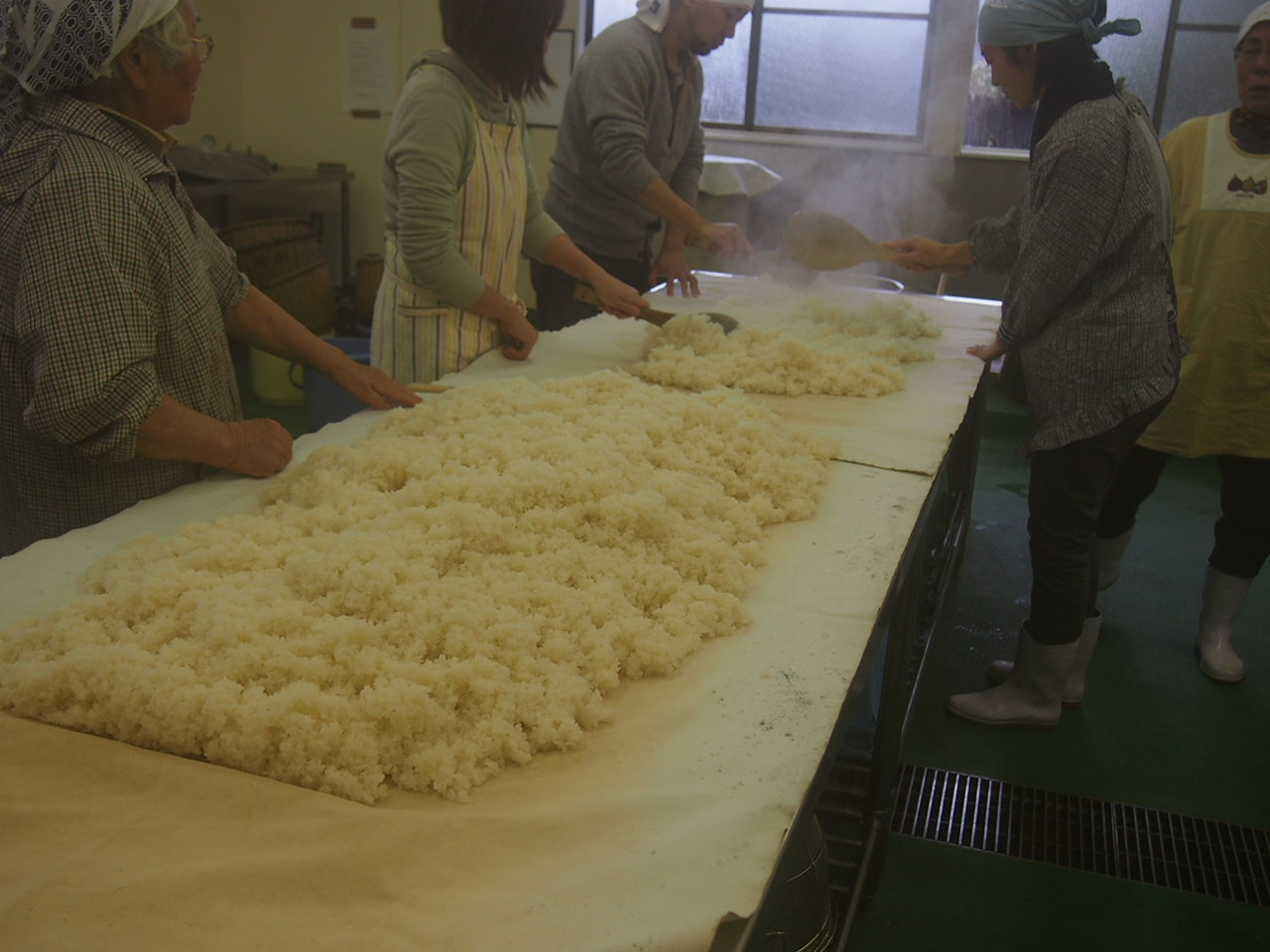 蒸したお米を広げて、冷まして、麹菌をまぶして…