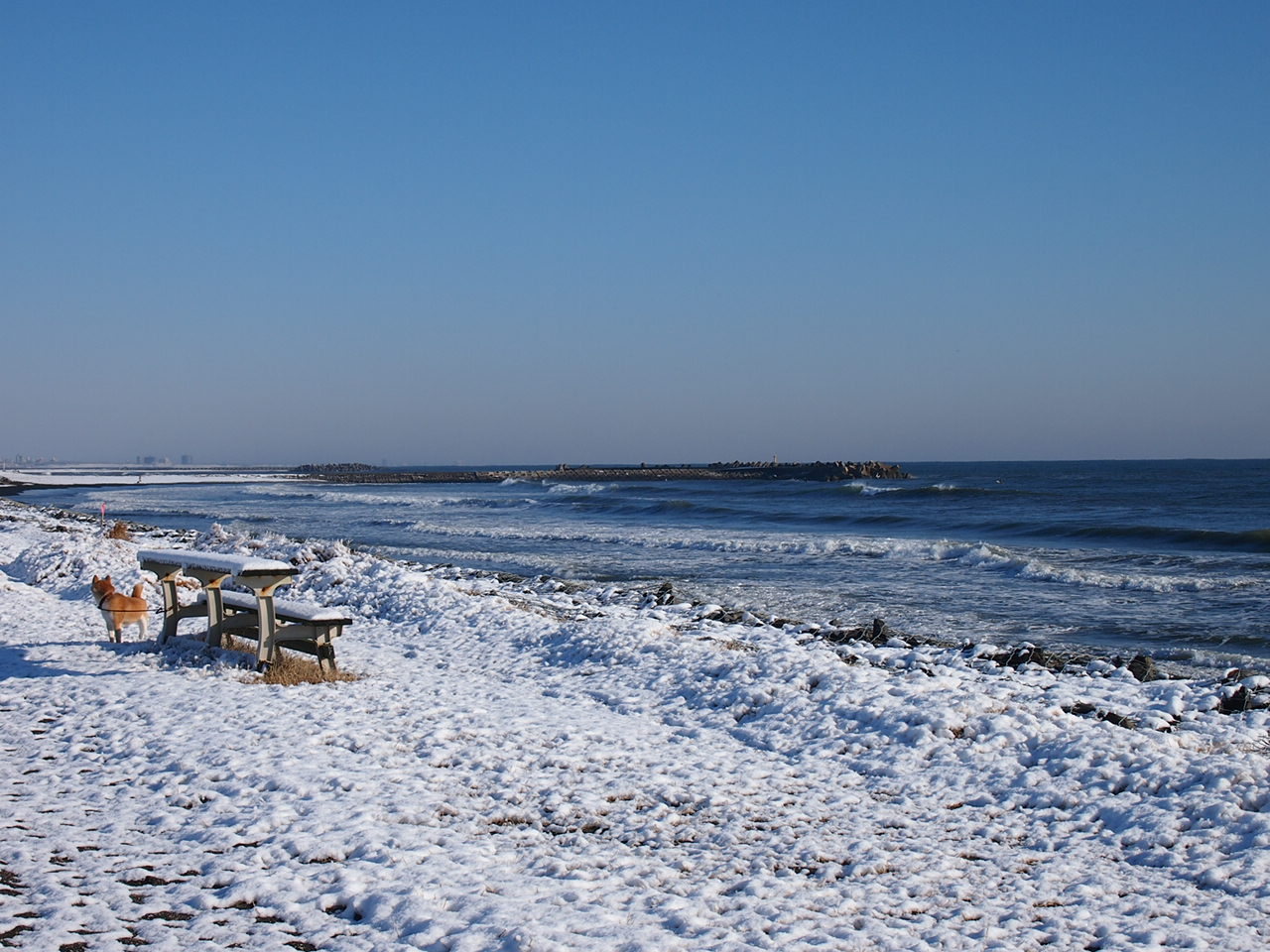 海岸も真っ白。さすがにサーファーさんは居ないだろうと思っていたら、ポツポツといらっしゃいました! 寒くないのかしら、と、波打ち際の海水を触ってみると、案外温かい。なるほど〜、海の中は外気温よりも温かいのかな??