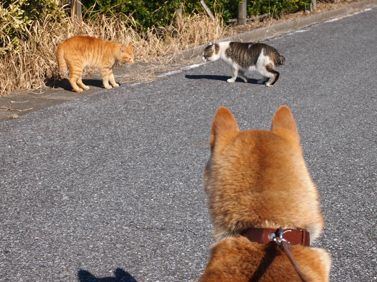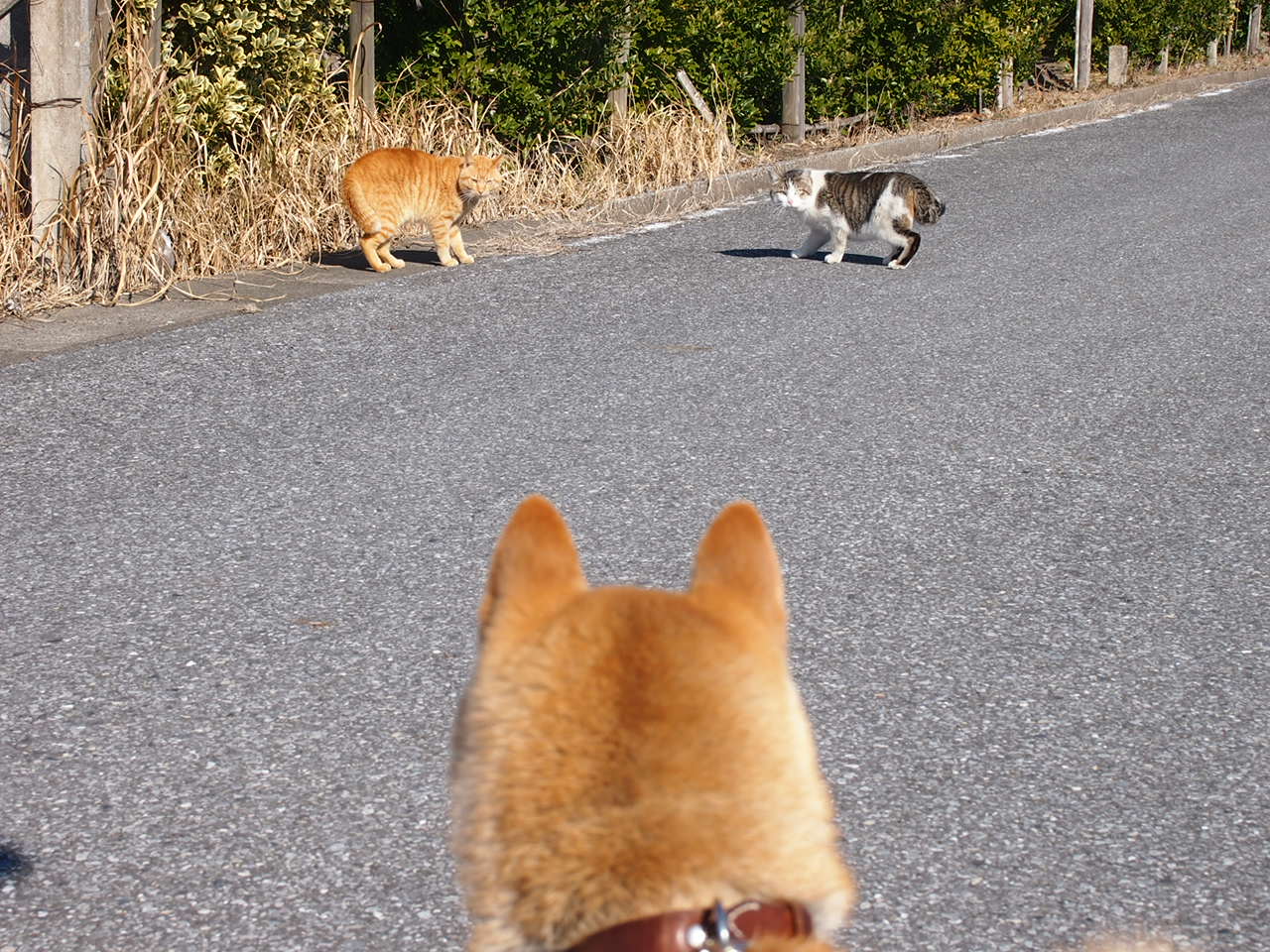 その後、犬が気になってケンカどころでは無くなったネコちゃん達は、去っていってしまいましたとさ…。