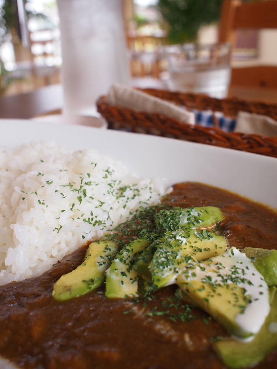 メニューはバナナがベースのアボガドチキンカレーや、自家製リンゴジャムのワッフルなど。