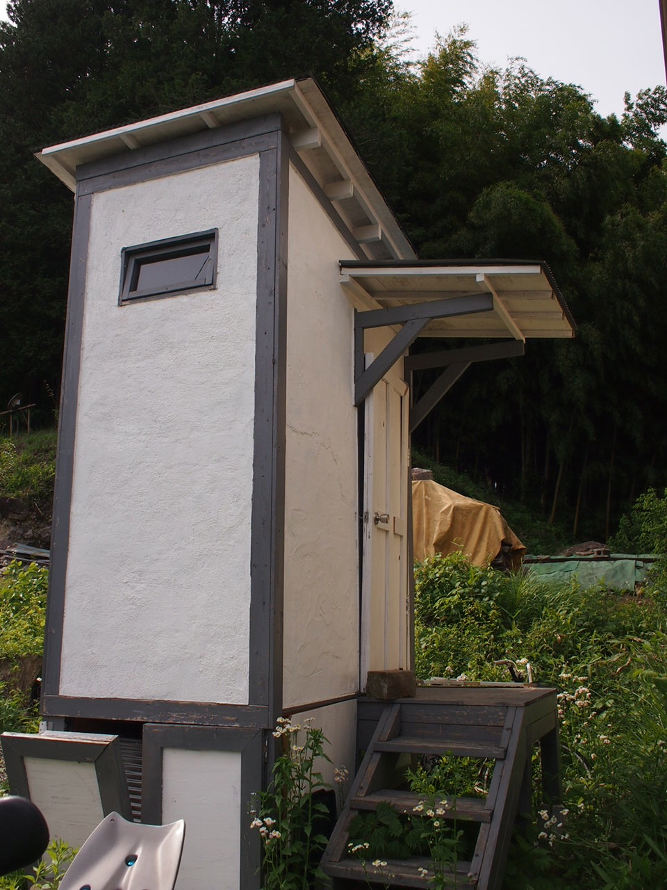 こちらは、自作の太陽熱温水器を設置した非電化薪風呂小屋と、潜熱蓄熱と籾殻断熱の非電化バイオトイレ。